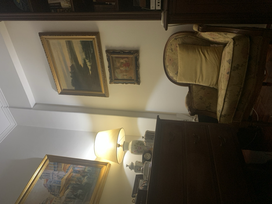 An interior corner of a room, situated within Lisbon, Portugal, is captured from a slightly low angle. The environment consists of white walls and a dark wooden floor, with ornate ceiling molding visible at the top. The scene is illuminated by a table lamp with a light-colored shade and a floral-patterned ceramic base, positioned on a dark wooden chest of drawers to the left. On the chest of drawers, alongside the lamp, are various decorative items including ceramic jars, one with a floral pattern, and a small clock. Three framed paintings adorn the walls. On the left wall, a large painting depicts a bustling street scene with multi-story buildings, awnings, and figures. On the right wall, a larger landscape painting shows a body of water or river under a cloudy sky, with distant structures on the horizon. Below this, a smaller framed painting displays an interior scene with several figures. To the right, an unoccupied upholstered armchair with a floral pattern and an ornate dark wooden frame is visible, featuring a plain light yellow cushion on its seat. A section of a dark wooden bookshelf or cabinet stands partially visible on the far right. No people are present or engaged in any actions or interactions within the frame.