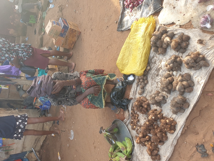 This image captures an outdoor market scene in Obosi, Nigeria. In the foreground and center, an elderly individual is seated on a low object on the reddish-brown dirt ground. This individual is wearing a patterned long-sleeved top, a colorful patterned skirt, and a dark head covering that extends over their forehead. Their right hand covers their face, obscuring their features. Light blue sandals are visible on their bare feet. Immediately in front of the seated individual, various food items are displayed on a light-colored tarp spread on the ground. These include numerous piles of small, irregularly shaped tubers (possibly cocoyams or small yams) scattered across the tarp. To the left, several green plantains rest on a round, silver-colored metal tray. Near the center, a black plastic bag and a small white object are on the ground. To the right, a large yellow mesh sack lies on the tarp, and further right, smaller piles of reddish-purple items (possibly onions or small tubers) are displayed on a different piece of cloth. In the mid-ground, behind the seated individual, three other people are partially visible. To the left, a person stands wearing a dark top and a patterned short skirt, with bare feet in light-colored flip-flops. To the right, another person stands wearing a floral top and a maroon skirt, also with bare feet in light-colored flip-flops. A third person is faintly visible in the deeper background to the left. The background reveals simple, crude wooden structures, indicative of market stalls or temporary shelters. Several cardboard boxes are stacked on the ground to the right. The ground is bare reddish-brown dirt, with scattered debris and plastic litter. The scene is illuminated by natural daylight.