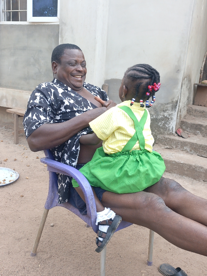 This image captures an outdoor scene in Akwanga, Nigeria, featuring two individuals. An adult male, with dark skin and a broad smile, is seated in a purple plastic chair. He wears a short-sleeved shirt with a black and white abstract pattern and dark shorts. A small, orange-colored cylindrical object is visible near his bare chest, which appears to be held or touched by the child. A young child, also with dark skin, is seated on the man's lap, facing away from the camera and towards the man. The child is dressed in a yellow short-sleeved shirt, a green skirt or overalls with suspenders, white ruffled socks, and dark sandals. The child's braided hair is adorned with red, blue, and white beads. The ground consists of reddish-brown dirt. In the background, a light-colored concrete building wall is visible, featuring a white-framed window with security grilles. To the left of the man, a small wooden bench is present, and a circular metal plate with scattered debris rests on the ground. To the right, a pair of dark slip-on sandals lies on the ground, with concrete steps partially visible in the far background.