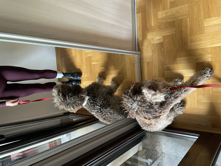 This image depicts an indoor scene within a residence in Boreti, Montenegro. The primary subjects are one partially visible human figure and two dogs. A human figure's lower torso, legs, and feet are visible. The individual is wearing form-fitting, dark burgundy leggings, white crew socks, and black lace-up combat boots. A red fabric leash is held in the person's left hand. Two dogs, appearing to be of a curly-coated breed, likely Lagotto Romagnolo or Poodle, are present. The dog in the foreground, positioned center-left, has matted, wet-looking brown fur and is lying or sitting on the light-colored parquet hardwood floor, facing generally towards the viewer with its head slightly angled upwards. The red leash from the human's hand is attached to its collar. The second dog, situated further back, is sitting upright on the hardwood floor, facing away from the viewer, and is seen directly and reflected in a large mirror on the right side of the frame. This dog also has brown curly fur and wears a light-colored collar, with no visible leash attached to it in this view. The environment consists of light-colored hardwood flooring laid in a parquet pattern. To the left, a partially open glass door or window reveals a limited outdoor view featuring a concrete surface. To the right, a large reflective surface, likely a full-length mirror or wardrobe door, reflects the lower body of the human and the background dog. A plain white wall is visible behind the reflected human figure. Natural light illuminates the scene, casting subtle shadows.