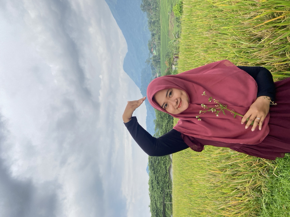 A female individual is depicted standing in Penanggungan, Indonesia, amidst a field of tall, green-yellow rice plants