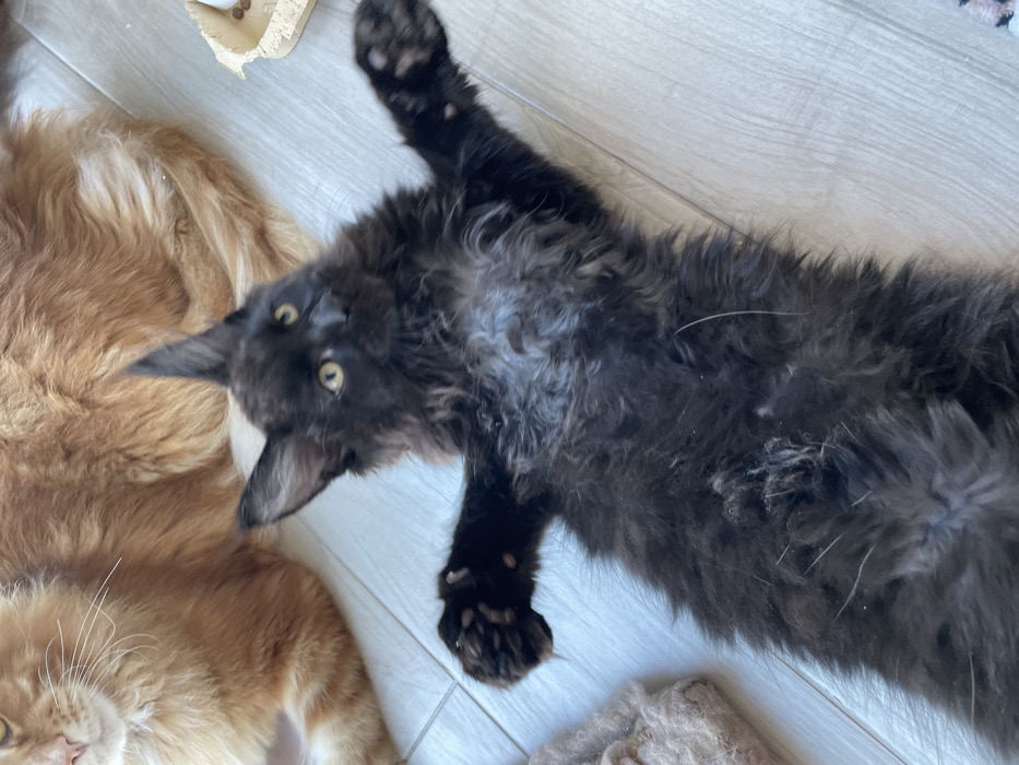 A black, long-haired kitten, characterized by its prominent ear tufts and long tail, lies on its back on a light-colored wooden floor. Its front paws are outstretched horizontally, with visible paw pads. The kitten's head is slightly tilted towards the right, and its yellow eyes are directed towards the viewer. Its chest displays patches of lighter, grayish-white fur amidst the predominantly black coat. In the upper left background, the head and a significant portion of the body of a larger, orange, long-haired cat, also lying down, are visible. A small, light-brown cardboard container holding dry pet food is partially seen in the upper right. A light brown, possibly felted or woven, object is partially visible in the lower left. Loose light-colored hairs are scattered across the floor and on the black kitten's fur. The scene takes place within an indoor domestic environment in the city of Batumi, Georgia.