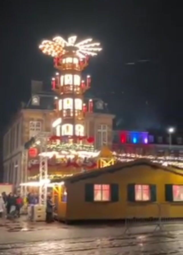 Christmas market at night. A tall, tiered Christmas pyramid dominates the scene, brightly lit with warm white lights. The pyramid has several levels with figures, and a fan-like ornament at the top. To the right of the pyramid, there are several small, yellow vendor huts, some decorated with lights. People are walking around the market, some wearing coats and hats. The ground appears wet and reflective. In the background, buildings are visible, some illuminated with colorful lights. The sky is dark, and the general atmosphere is festive.