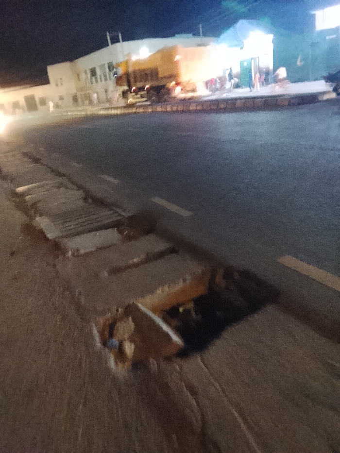 A street scene at night. A truck and several people stand in front of a brightly lit building in the background. The foreground shows a portion of the street with concrete dividers. One section of the divider is broken, leaving a dark opening in the ground. The street surface appears rough and is marked with a white line. Overall, the scene is dimly lit and slightly out of focus.