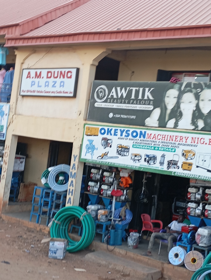 A multi-business storefront displays signs for "A.M. Dung Plaza," "Awtik Beauty Parlour," and "Okeyson Machinery Nig. E." The machinery store is filled with equipment, including generators and agricultural machines. A man sits inside the store. Rolls of green hose sit stacked outside. Signage for "Honda" and "Yamaha" is visible.