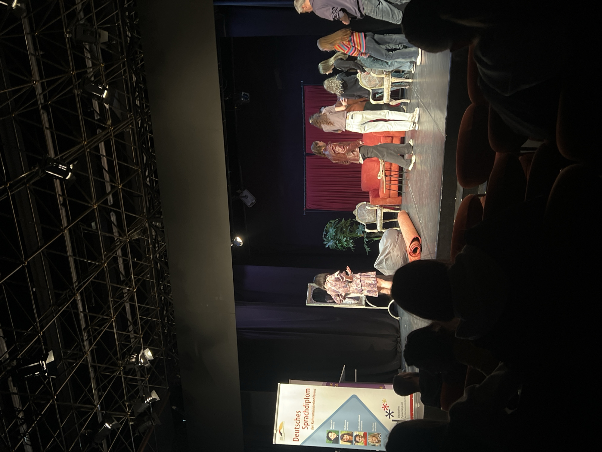 The image depicts a stage performance in Ruse, Bulgaria. The stage features several actors in various poses and attire, some standing and some seated on furniture such as chairs and a red sofa. A banner with the text "Deutsches Sprachdiplom" is visible at the front of the stage. The audience sits in darkened rows of seats, watching the performance. Stage lighting is present on the left side.