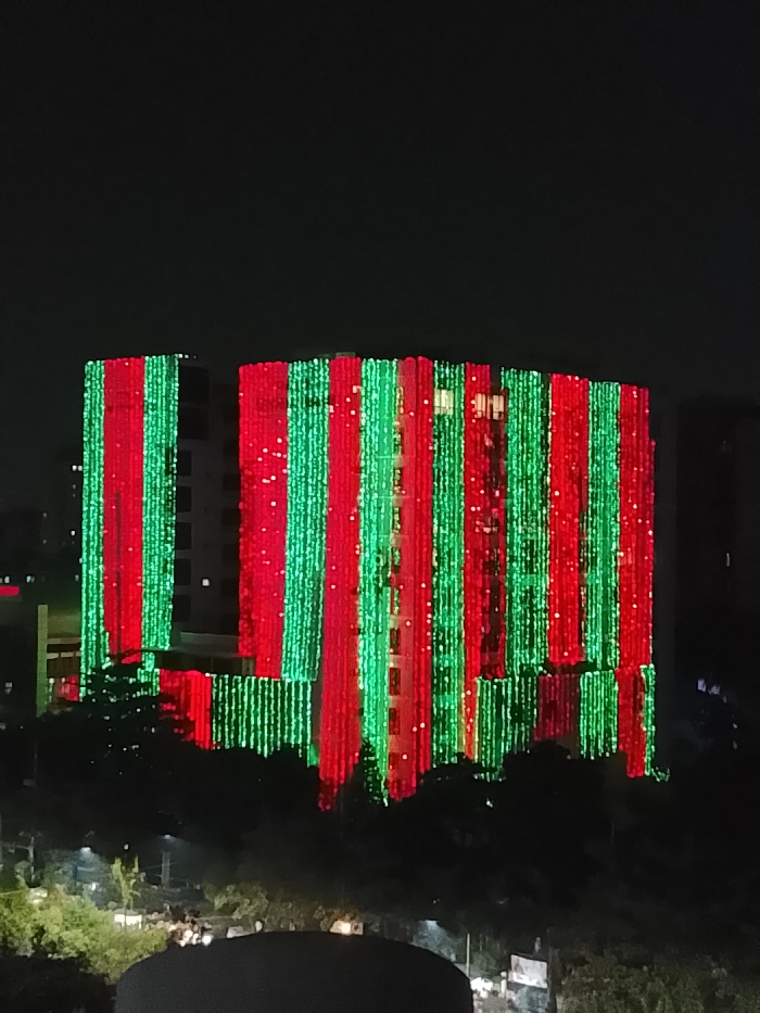 The image displays a multi-story building at night in Dhaka, Bangladesh. The building's visible facade is extensively illuminated by numerous vertical strings of electric lights, arranged in alternating stripes of red and green. These light stripes extend from the upper levels down to the lower sections of the structure. The sky above is dark and featureless. In the middle ground, below the illuminated building, dark silhouettes of trees or dense foliage are present. The immediate foreground is obscured by an unidentifiable dark, curved mass, consistent with a rooftop or an elevated barrier. No human figures, specific objects beyond the lights, or discernible actions are identifiable within the frame.