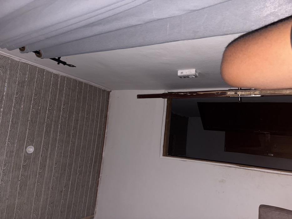A low-angle shot reveals a dimly lit room. Textured, wood-like paneling covers the left wall, contrasting with the smooth white walls on the right. Overhead, a gray curtain or drape partially obscures the view. A small rectangular object is attached to the ceiling, likely a smoke detector. The room features a window with a dark frame, revealing a television screen and additional shadowy interior space within.
