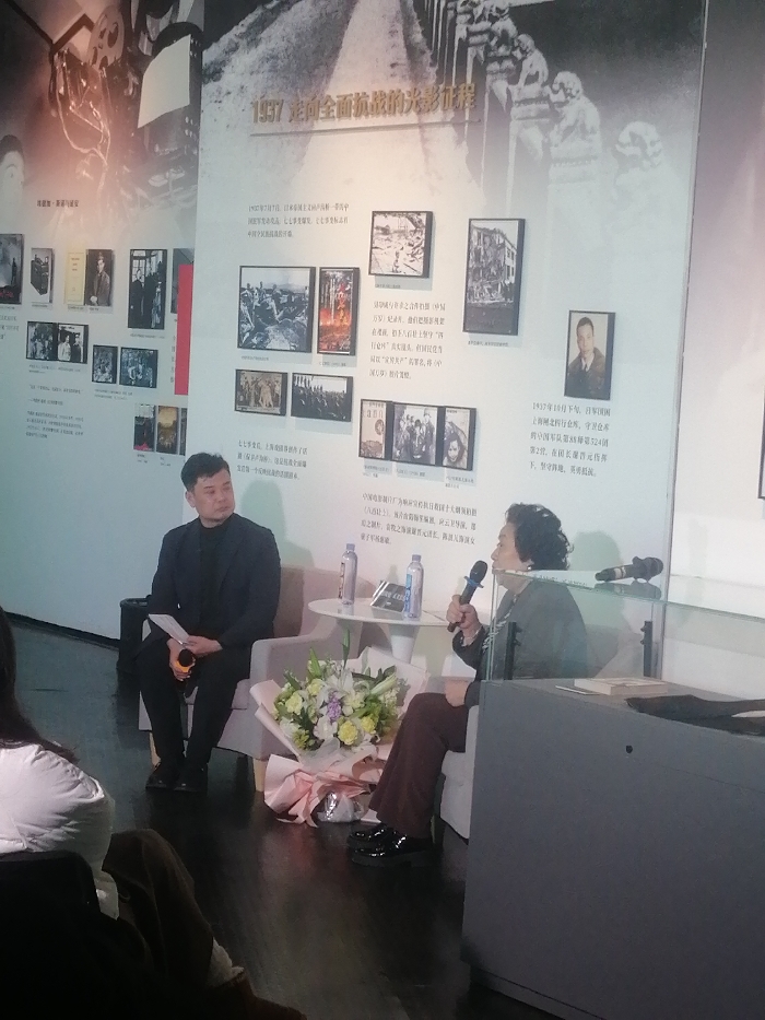 An indoor event is depicted within an exhibition hall in Fengtai District, China. Two individuals are seated in light grey upholstered armchairs, facing each other. On the left, a male in a dark suit holds paper notes in his left hand, looking towards the right. On the right, a female with dark, curly hair holds a black microphone in her right hand, positioned as if speaking. A small white round table between them displays two plastic water bottles, and a large bouquet of white and green flowers, wrapped in pink, rests on the dark, reflective floor in front of the table. The background comprises a large white wall serving as an exhibition display, featuring numerous historical black-and-white photographs, documents, and Chinese text. A prominent heading includes "1937", and images related to early cinema, such as a film projector, are visible. Audience members are partially visible in the lower left foreground.
