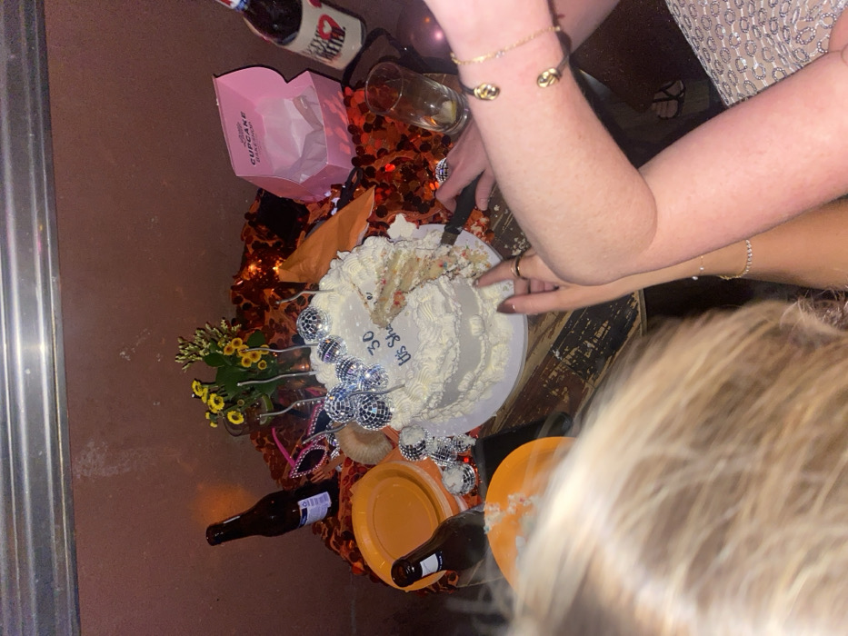 The image captures an indoor birthday celebration in a dimly lit establishment within New York City. The central subject is a partially cut, white-frosted round cake decorated with small silver disco balls acting as candle holders, featuring "30 It's Sha[ne/ne's]" inscribed in blue icing. The visible cross-section of the cake reveals multiple layers of white cake with colorful sprinkles. At least two individuals are present. On the right, a person's arms are shown actively cutting a slice of the cake with a black-handled knife. This individual wears a gold band and a darker ring on their left hand, and two gold bracelets on their right wrist. A portion of a silver sequined garment is visible on this person. In the upper-left foreground, the blonde hair of a second individual is partially visible. A foot wearing dark sandals is discernible beneath the table on the right side. The table, dark and textured, is strewn with red and orange metallic confetti. Other objects include a bouquet of yellow flowers in a clear glass vase, two brown glass bottles (one partially obscured), a clear glass tumbler containing liquid, and a red-labeled bottle with "WEEDER" visible. Two orange paper plates, one with white residue, and a crumpled orange napkin are also present. An open, empty pink box labeled "CUPCAKE BAKE SHOP," consistent with the "Little Cupcake Bakeshop" chain operating in New York City, sits on the table. Two pairs of novelty sunglasses (one pink, one black/silver) are also visible. The background consists of a reddish-brown wall with a horizontal metallic trim at the top, illuminated by warm, artificial lighting.
