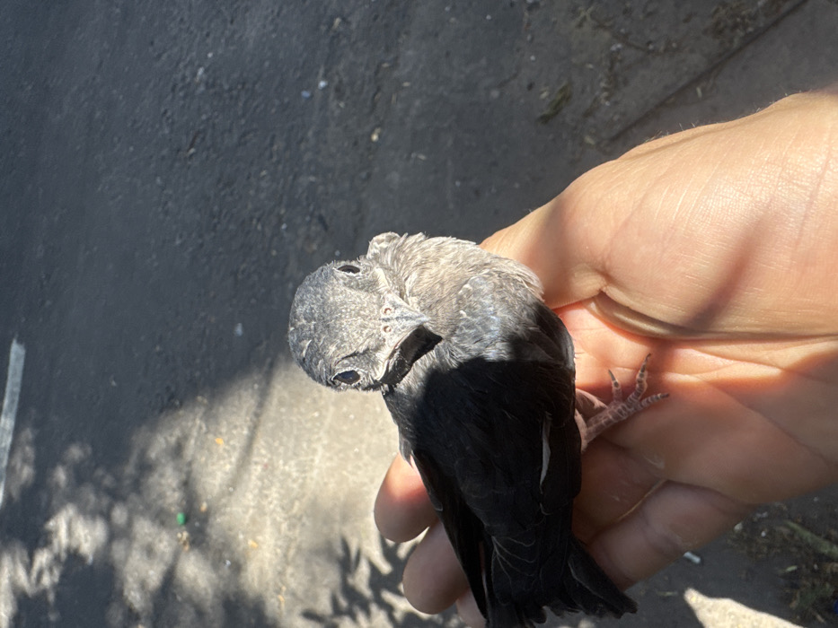 A small bird with gray head feathers and dark, possibly black, body feathers rests in the palm of a hand. The bird's head is tilted, almost touching its back. The person's hand is large and has light skin. The background includes a section of asphalt pavement with a white painted line and some sparse vegetation. The lighting is bright and sunny, casting shadows on both the bird and the hand.