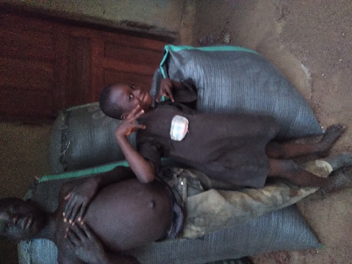 A bare-chested adult lies supine on a sack, hands clasped over a distended abdomen