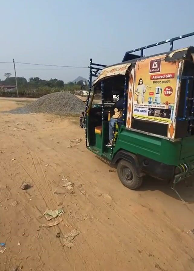 green auto-rickshaw stationary on a dirt lot. The vehicle has a rack on top, and advertisements on its side panels. A person wearing jeans is seated inside. Behind the auto-rickshaw is a pile of gravel. The ground is a mix of dirt and debris. The sky is clear and blue. In the distance, there are trees and power lines. The video shows the rickshaw from the side, then the view pivots to show the back of the vehicle. The engine is running.