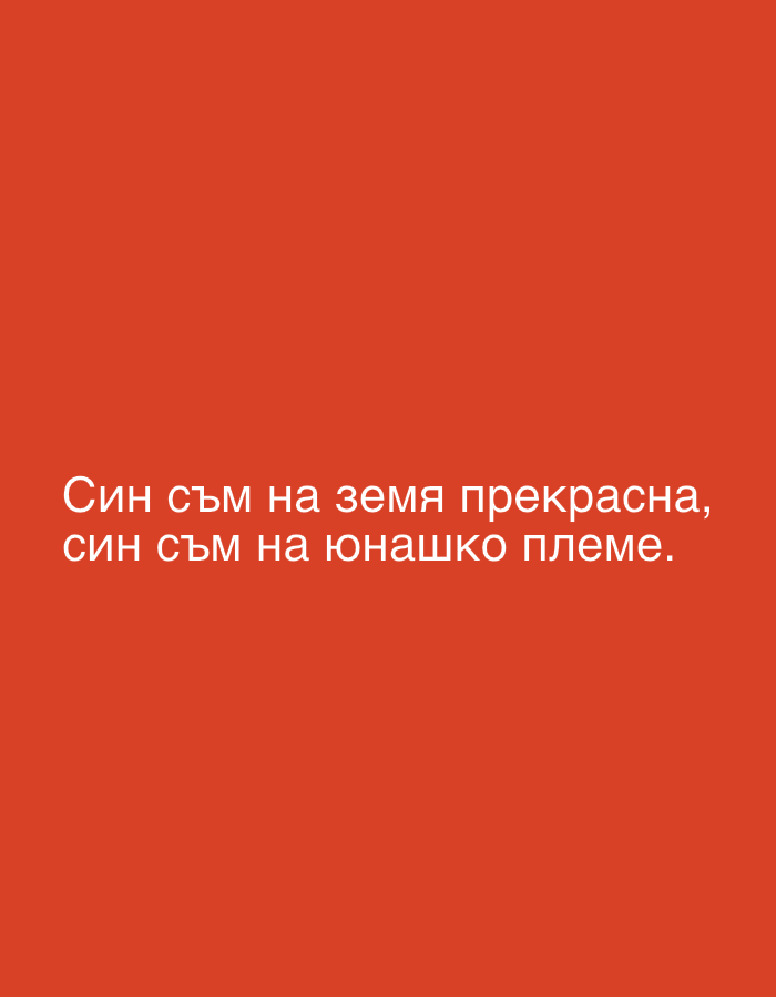 The image displays a solid, uniform red background. Centrally positioned in the lower mid-section are two lines of white Cyrillic text. The first line reads: "Син съм на земя прекрасна,". The second line reads: "син съм на юнашко племе." No individuals, distinct objects, or environmental elements are present other than the textual overlay on the red field. No discernible action or interaction is taking place. The specified location is the city of Unknown, Unknown.