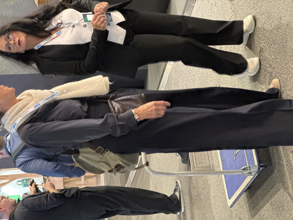 The image displays an indoor scene, likely within an event or exhibition hall in Chassieu, France, characterized by light grey textured flooring and light-colored partition walls in the background. Four individuals are visible. On the far left, a male, partially seen, wears a black long-sleeved top, black pants, and dark sneakers with white soles. He holds a dark rectangular object, possibly a smartphone, with both hands and wears glasses. Behind him, a green object is partially visible on a surface. To the right and slightly behind, a second male, with his back mostly to the camera, wears a blue long-sleeved garment and a dark backpack. In the central foreground, a female, estimated to be middle-aged to older, is seen from the waist up, facing slightly right. She wears a dark long-sleeved top, dark wide-leg pants, and beige flat shoes. A beige knitted scarf is draped around her neck, secured by a white lanyard with blue graphics. A small, dark brown leather crossbody bag hangs from her right hip. A gold-toned bracelet adorns her right wrist, and a gold-toned ring is on her left ring finger. To her right, a second female, also appearing middle-aged to older, stands facing slightly left, looking forward. She has dark hair, wears black-framed glasses, a black blazer, a white sleeveless button-up vest with dark buttons, black trousers, and white athletic shoes. A white lanyard with blue and black text (partially visible as "Poly...") and a badge holder hangs around her neck. Her hands are loosely clasped in front, with a ring visible on her left ring finger. Between the second male and the central female, a light blue and silver-colored hand cart with a textured platform is positioned on the floor.