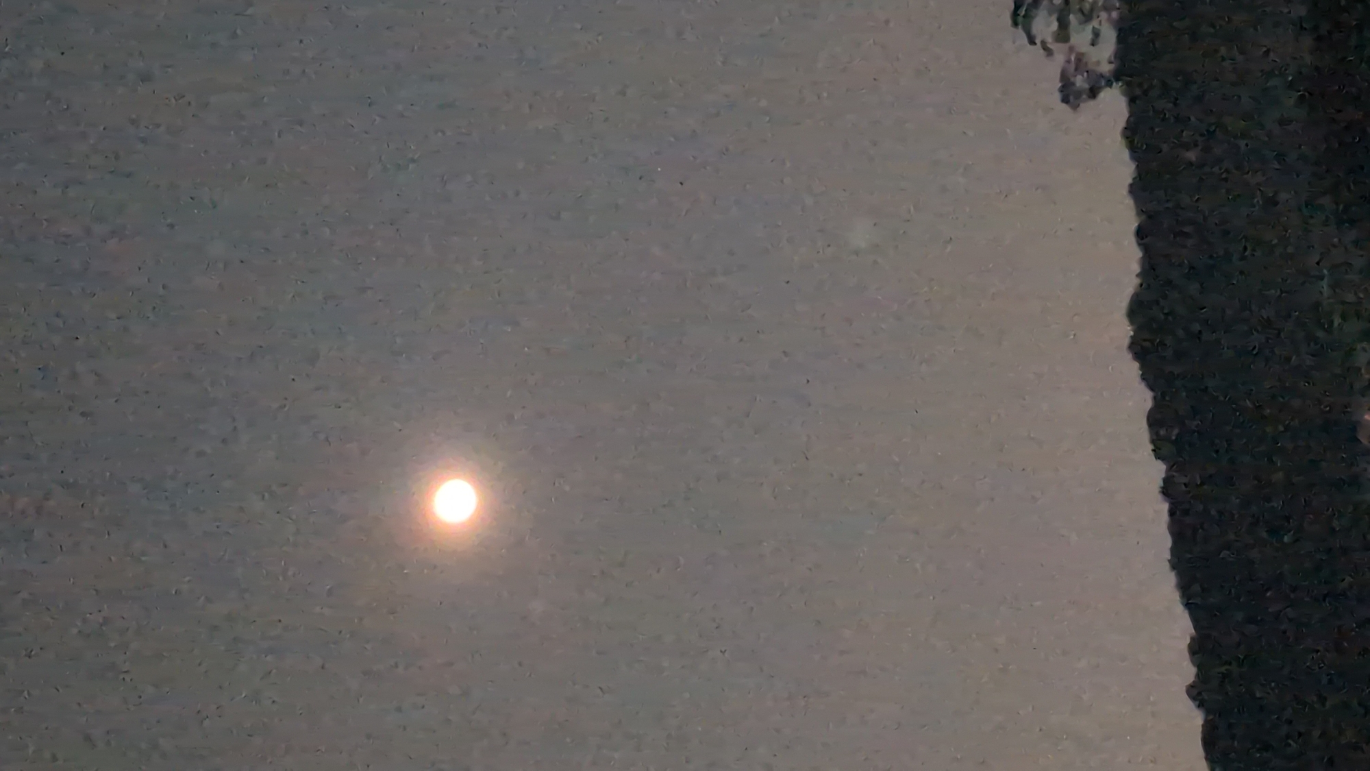 The image appears to be taken in an area affected by smoke or heavy fog, possibly in the city of Cam Ly - Da Lat, Vietnam, or similar hilly terrain, based on the rugged, dark formation on the right edge of the frame. The light source on the left looks like the sun, significantly dimmed and filtered by the atmospheric conditions.