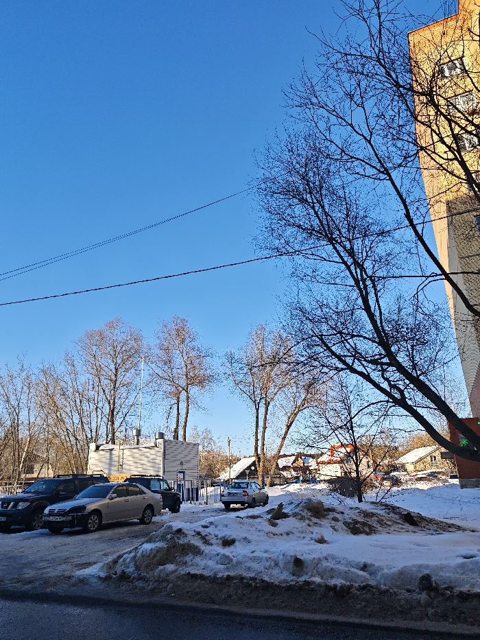 The image presents an urban winter or early spring scene in Dmitrov, Russia, under a clear, bright blue sky. In the foreground, dark asphalt pavement transitions into large, dirty snow piles mixed with earth. The midground features four parked vehicles: a dark SUV on the far left, followed by a silver sedan with its front bumper missing, another dark SUV/pickup truck, and a silver sedan facing away from the viewer. Behind these vehicles, a light-colored utility building with multiple roof vents and blue striped fencing is visible. Numerous bare deciduous trees are scattered throughout the midground and background. On the far right, a multi-story, yellow-orange apartment building with visible windows partially rises into the frame, also partially obscured by bare tree branches. In the background, residential houses with snow-covered pitched roofs are discernible through the trees. Two dark electrical wires stretch horizontally across the sky in the upper mid-section of the image. No individuals are present in the scene.