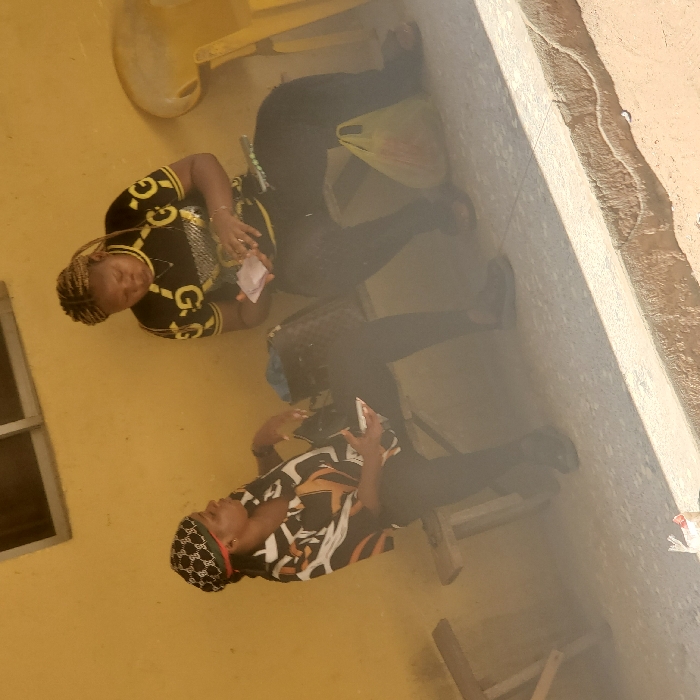 Two individuals are depicted seated under a covered structure in Ihiagwa, Nigeria. The background consists of a plain, light yellow-painted wall featuring a single high-set rectangular window with dark frames. Two wooden benches serve as seating. The individual on the left wears a long-sleeved shirt patterned in black, white, and orange, black trousers, and a black patterned headwrap with a red trim. This individual is seated on a wooden bench, holding a small white object in their hands, and appears to be oriented towards the right. A dark-colored bag is positioned on the bench next to them. The individual on the right wears a black short-sleeved t-shirt adorned with gold "GG" logos and gold accents, black trousers, and possesses light-colored braided hair. This individual is also seated on a wooden bench, looking downwards, and is actively manipulating a stack of small, light-colored papers or cards with both hands. A yellow plastic carry-bag rests on the ground near their feet. A portion of a yellow plastic chair is visible to their immediate right. The foreground features a concrete slab that transitions to an unpaved ground area, separated by a distinct raised concrete curb. A general atmospheric haze or dust is present in the lower part of the frame. The scene is illuminated by strong daylight.