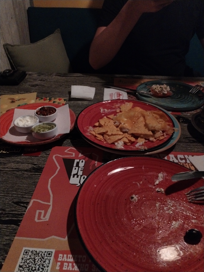 The image depicts an indoor dining area under artificial, dim lighting. A dark wooden table occupies the foreground and midground. A person's upper torso and right arm are visible in the background, seated at a blue upholstered booth with a light green throw pillow, wearing a dark short-sleeved garment. On the table, a large red ceramic plate with a spiral pattern contains partially consumed nachos topped with melted cheese and other ingredients. Adjacent to it, a smaller blue/teal spiral-patterned plate holds a single, partially consumed portion of a salad-like item, possibly a scoop of white salad on a red base, with a fork resting on its surface. A second, mostly empty red spiral-patterned plate exhibits food residue, including smudges, crumbs, and a single black olive, accompanied by a fork and a knife. A small red plate serves as a tray for three white ramekins containing dips: a reddish dip (salsa), a white creamy dip (sour cream or crema), and a green dip (guacamole). Additional items on the table include a folded white paper napkin, a small black wallet, and a white packet labeled "Somersby". Two placemats are visible: one with colorful geometric patterns and another red placemat with white Cyrillic text, reading "ГОРЕЩО" (Hot) and "ВАШЕТО Е ВАЖНО ЗА" (Your is important for) above a QR code, indicating a Bulgarian linguistic context. The background behind the seated individual includes a yellow stripe above the blue booth. The location is in the city of Unknown, Unknown.