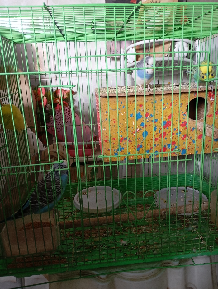 - "The image displays four parakeets (budgerigars) contained within a rectangular green metal wire cage, situated indoors in Nasiriyah, Iraq" by FM-qjUs52, licensed under CC BY 4.0