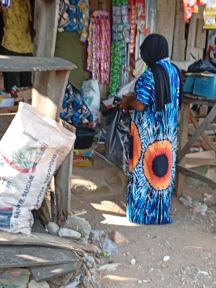 The scene depicts an outdoor market stall in Unknown, Unknown. A person, likely female, stands with their back partially turned towards the camera, positioned slightly right of center. This individual wears a long, loose-fitting garment featuring blue, white, and black tie-dye patterns, accented by two large orange and black concentric circles on the lower back. A black head covering is worn. The person holds a black plastic bag with both hands, suggesting an action involving the contents. To the left, a large white sack, partially labeled "DANGOTE SUGAR," leans against a rough wooden post. Behind this structure, parts of two other individuals are visible: one wearing a yellow top and dark lower garment, and another wearing a blue and white patterned top with an olive-green skirt or wrap. The back wall of the market stall is constructed from rough wood and displays various brightly colored packaged goods, including items in pink, green, and blue packaging, hanging from improvised shelving. The ground is unpaved, consisting of dry, uneven dirt or sand, scattered with rocks, small pieces of debris, and what appears to be discarded plastic. A rudimentary wooden table supports a blue box on the right side of the image. The environment suggests an informal commercial setting under direct daylight, casting defined shadows.