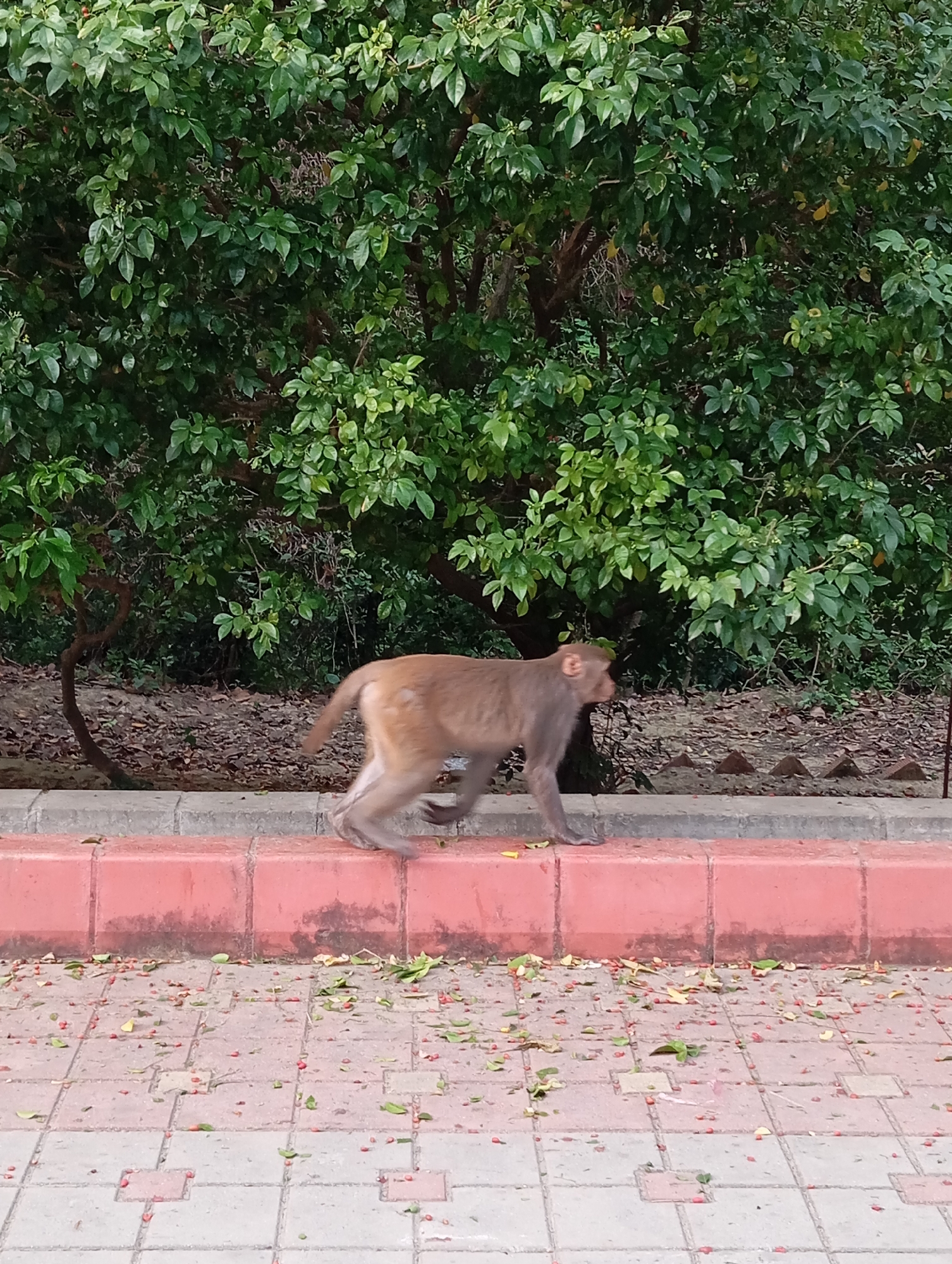 The image depicts a street scene in Oshojetban, Nepal. A single light brown monkey, likely a macaque, is captured in motion, walking from right to left across a concrete curb. The monkey's body is oriented towards the left, with its head turned to the left profile, showing its right ear. Its limbs are actively engaged in movement, suggesting a trot or walk. The curb consists of a reddish-orange lower section and a grey upper section, upon which the monkey is positioned. Below the curb is a paved sidewalk made of interlocking grey and reddish-brown square tiles. The sidewalk surface is littered with numerous small red berries or seeds and scattered green and yellow leaves. Behind the monkey and curb, in the middle ground, is a strip of bare earth covered with dried leaves. The background is dominated by dense, lush green foliage from bushes and trees, with some darker branches visible through the leaves. The overall lighting is diffused, without harsh shadows. No human figures are present.