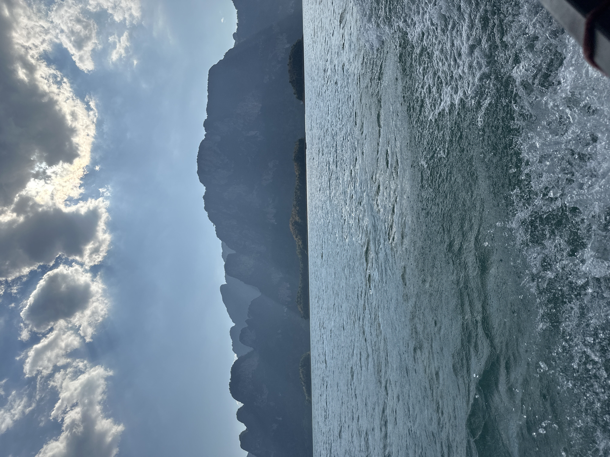 The image depicts a waterscape in Ban Chiao Lan, Thailand. On the left, a dramatic mountain range rises against a sky with scattered clouds. The right side of the image is filled with water, disturbed by the movement of a boat, evident in the spray and ripples.