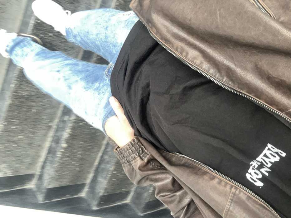The image displays a high-angle, downward perspective focusing on the lower torso and legs of an individual. The subject is wearing a brown, worn-appearance leather jacket, partially unzipped, revealing a black t-shirt underneath. A segment of a white graphic or text, appearing inverted due to the camera angle, is visible on the lower left of the t-shirt. The individual's left hand rests on their upper thigh or lower abdomen. They are wearing light blue, acid-wash denim jeans and white athletic shoes on their feet. The background consists of dark grey, textured steps, consistent with concrete or stone, indicating the individual is situated on a staircase or tiered seating structure. The specific location within the city of Varna, Bulgaria, cannot be determined from the visual evidence present in the image.