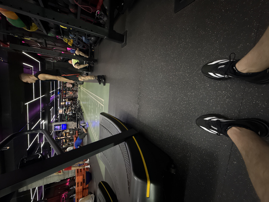 The image depicts the interior of a Pulse Fitness gym in Sofia, Bulgaria. The viewpoint is low, showing the forelegs and feet of an individual wearing black Adidas Adizero running shoes with white stripes and laces, resting on a dark gray speckled rubber gym floor. To the immediate left, the front, curved section of a black and yellow treadmill is visible. The midground and background reveal a large, well-lit fitness area with a dark ceiling featuring linear purple neon lights. A long, light green marked track with white numbers and lines runs through the center of the gym floor. On the left side, a person in red apparel stands near orange stability boxes and a blue Bosu ball. Further along the track, another individual in a blue shirt is performing a floor exercise, appearing to be in a push-up position. In the midground, to the right of the green track, a tall male with short light hair, wearing a black tank top and black shorts with an orange stripe, stands facing left, with visible tattoos on his lower legs. He appears to be between exercise sets. To the far right, a black metal shelving unit, presumably for storing weights or equipment, is visible, with a person in a light green shirt partially seated nearby. Other gym equipment and individuals are indistinctly visible further in the background.