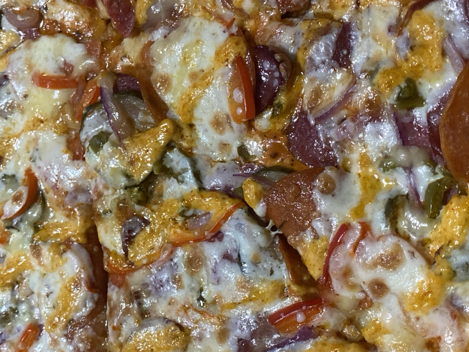 A close-up depicts a pizza laden with toppings and melted cheese. Visible ingredients include pepperoni, red onion slices, red bell pepper strips, and green peppers. The cheese is bubbly and browned in places, indicating it has been baked until melted and slightly crisp. A yellowish sauce is spread unevenly beneath the cheese, adding color and richness to the pizza.