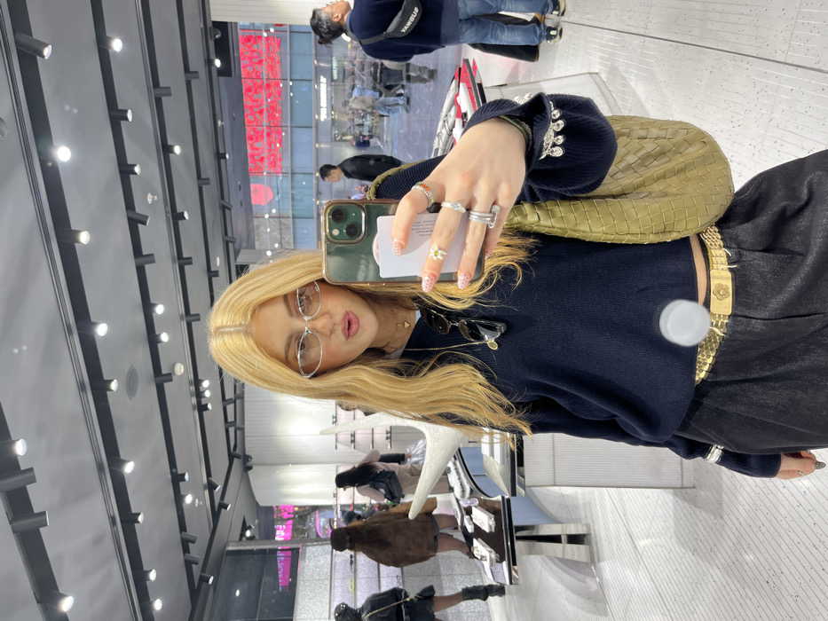 A woman with long, blonde hair and glasses takes a selfie in a store. She wears a dark sweater with embellished sleeves, a gold chain belt, and a woven shoulder bag. She has rings on her fingers and a flower design on her nails. Sunglasses hang from her top. The background features store displays, lighting fixtures, and other shoppers. The image is taken from a slightly high angle, showing the woman and the surrounding environment in a retail setting.