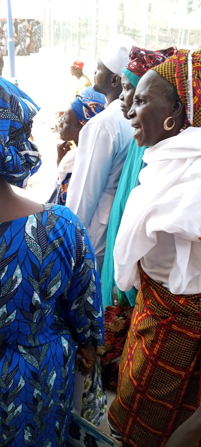 This image captures a daylight street scene in Lafia, Nigeria, featuring a group of individuals in the foreground and a blurred crowd in the background. The perspective is from behind a foreground subject, looking into a gathering. In the immediate foreground, to the left, an individual with dark skin is visible from the back, wearing a royal blue garment with a black and light blue/green leaf pattern, paired with a matching headwrap. Their right arm and hand are discernible. To the right of this foreground figure, four individuals are arranged sequentially, primarily in profile, facing towards the left: 1. A dark-skinned woman with a blue patterned headwrap and dress, her right hand near her chin. 2. A dark-skinned man wearing a white *kufi* cap and a white long-sleeved shirt, exhibiting a faint beard. 3. A dark-skinned woman wearing a vibrant teal headwrap and a light-colored long-sleeved garment. 4. On the far right, a dark-skinned elderly woman is partially visible, wearing a white headscarf over a red, yellow, and black grid-patterned headwrap labeled "REAL WAX HOLLANDAIS VISCO." She has a prominent gold-colored, ridged hoop earring in her visible ear, and her mouth is open, indicative of speech or laughter. She wears a white top over a similarly patterned red, yellow, and black skirt or wrapper. The background is brightly lit and out of focus, revealing numerous blurred human figures, some suggesting uniforms, in an open outdoor area, possibly a street or plaza. A light blue pole stands on the far left of the background. The scene is illuminated by strong sunlight, casting minimal shadows directly on the foreground subjects.