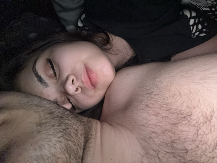 The scene depicts two individuals in close physical proximity, located indoors in Atiya, Bulgaria. A female, with dark hair and eyes closed, rests her head against the shoulder/chest area of a male. Her lips are slightly parted, suggesting sleep or deep relaxation. She is partially clothed in a dark garment with a white patterned trim visible near her right shoulder. The male's upper body, specifically his left shoulder, arm, and chest, is visible, characterized by dense dark body hair. A portion of his cheek/jaw with facial hair is visible on the far left. The lighting is dim, indicating an evening or low-light indoor setting, likely a bed. No other objects or specific environmental details are discernible.