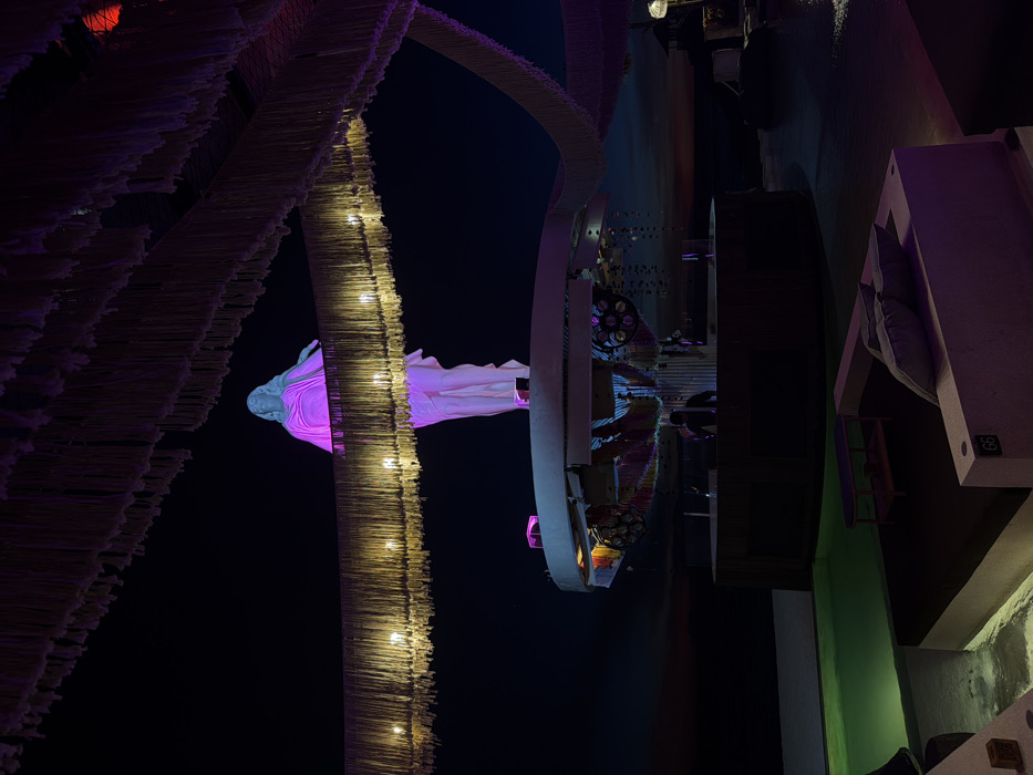This image captures an outdoor entertainment venue or lounge at night, located in Ungasan, Indonesia. A prominent, tall, white statue of a robed figure, illuminated with pink light on its upper body, stands centrally atop a circular platform. This platform functions as a bar or DJ booth, featuring reflective panels and multi-colored lighting on its underside. One individual, dressed in dark attire, is visible standing behind the bar, facing outward. Above, multiple tiers of light-colored, fringe-like decorative strands, embedded with warm white lights and partially illuminated by purple light, form an overhead canopy. In the foreground, white-framed seating areas with dark cushions are visible, one unit featuring the number "66" and a small purple object on an adjacent table. To the left, a water feature or pool exhibits a green luminescence from underwater lighting. The distant horizon is faintly visible against the dark sky, indicating an open-air environment.