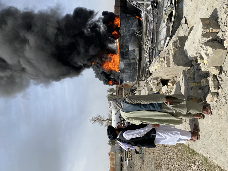 This image depicts an active industrial fire in Khvoshab, Afghanistan