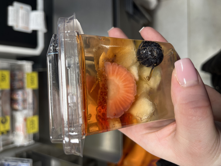 A close-up image, taken in Shevlyakovo, Russia, depicts a translucent plastic cup held by a human hand. The hand, with fair skin and short, light pink manicured fingernails, grips the lower right side of the cup. Inside the cylindrical cup, an amber-toned clear liquid suspends various cut fruits: slices of red strawberry, including one prominent half-slice, multiple diced pieces of a pale yellow fruit consistent with banana or apple, and a single dark, spherical fruit resembling a blueberry or dark grape positioned towards the bottom right. Small air bubbles are visible within the liquid. The cup is sealed with a clear, domed plastic lid. The background is out of focus, revealing indistinct shelves with yellow price tags and a white fixture, indicative of an indoor commercial setting such as a grocery store or cafe.