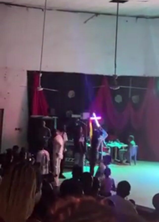 A dimly lit performance hall is filled with seated audience members watching a live music performance on a stage. The stage backdrop is black with red draped fabric. The musicians and singers are performing in the center of the stage. One performer in the foreground is twirling illuminated sticks. The audience is watching the performance, with the back of some heads visible. The lighting in the hall is predominantly purple and green, with ceiling fans rotating above. A screen in the background displays visual content.