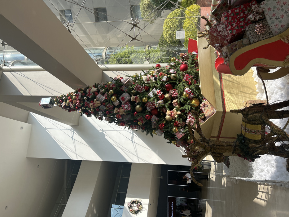 A tilted view shows a large Christmas tree adorned with red and gold ornaments and gift-wrapped boxes, mounted on a platform. Attached is a red and gold sleigh filled with wrapped presents. A reindeer-like structure, crafted from natural materials, appears to be pulling the sleigh. The display is set within a modern, brightly lit mall, and a wreath is visible in the background below.