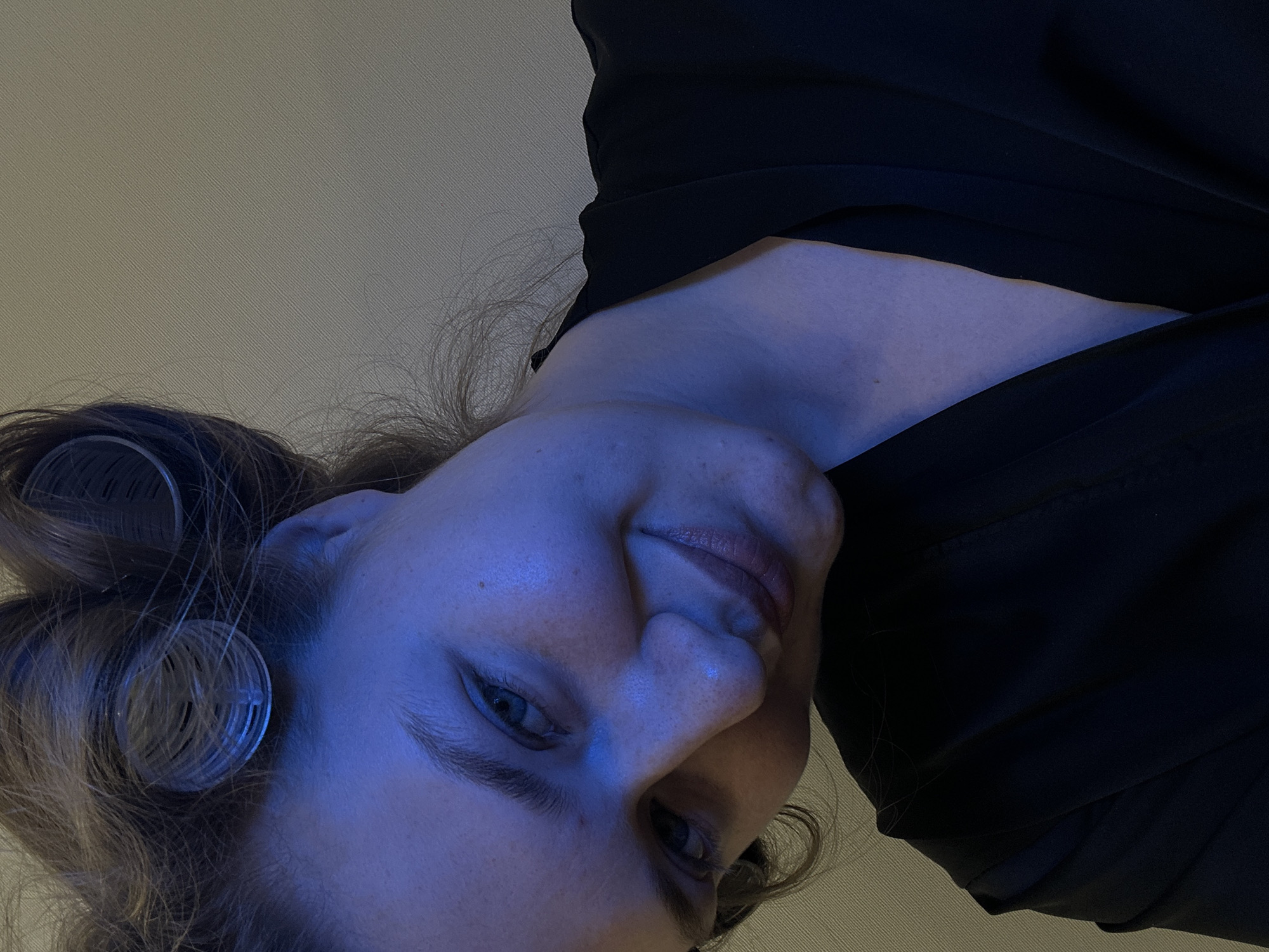 A close-up, tilted portrait of a woman's face, predominantly lit with blue light. Hair curlers are visible in her hair. She is wearing a dark-colored garment, possibly a robe or top, on her upper body. The background appears to be a neutral-colored wall. The location is unspecified.