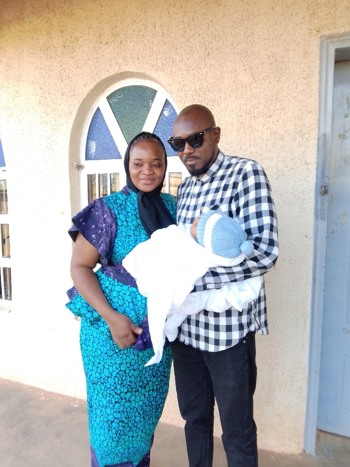 A family portrait shows a woman in a patterned dress and headscarf standing next to a man in a checkered shirt and sunglasses. He is holding a baby wrapped in a white blanket and wearing a blue knit cap. They are posing outdoors against a building with an arched window and a closed door. The scene is brightly lit with natural light.