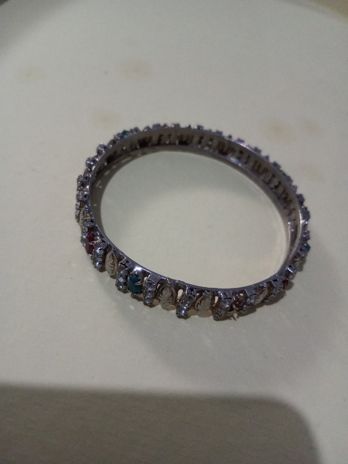 A silver-toned bangle lies on a light surface. The bangle is adorned with repeating patterns. Each pattern consists of a small, leaf-like shape with a tiny, clear gemstone or bead above it. Periodically, larger, colored gemstones (red and green visible) replace the clear gemstones within the pattern. The overall design gives the impression of a delicate, yet intricate piece of jewelry. A shadow obscures the bottom of the image.