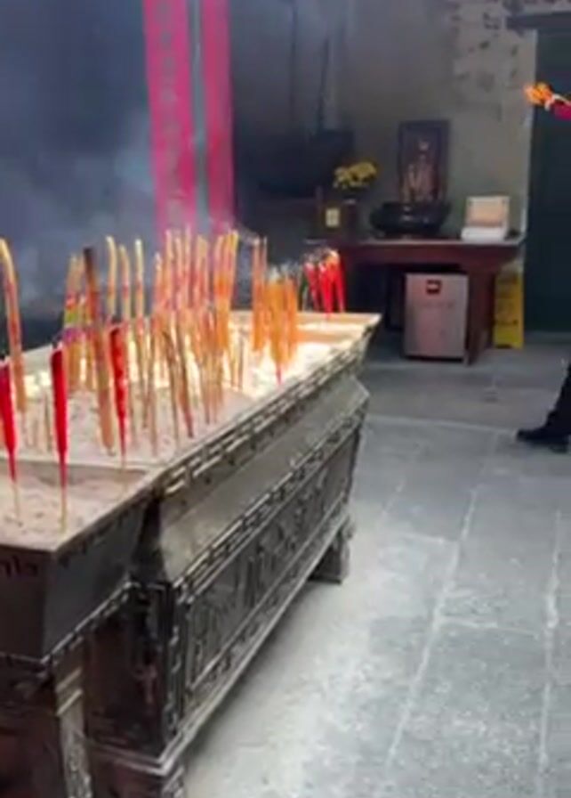 people lighting and placing incense sticks in a large, decorative, metal incense burner