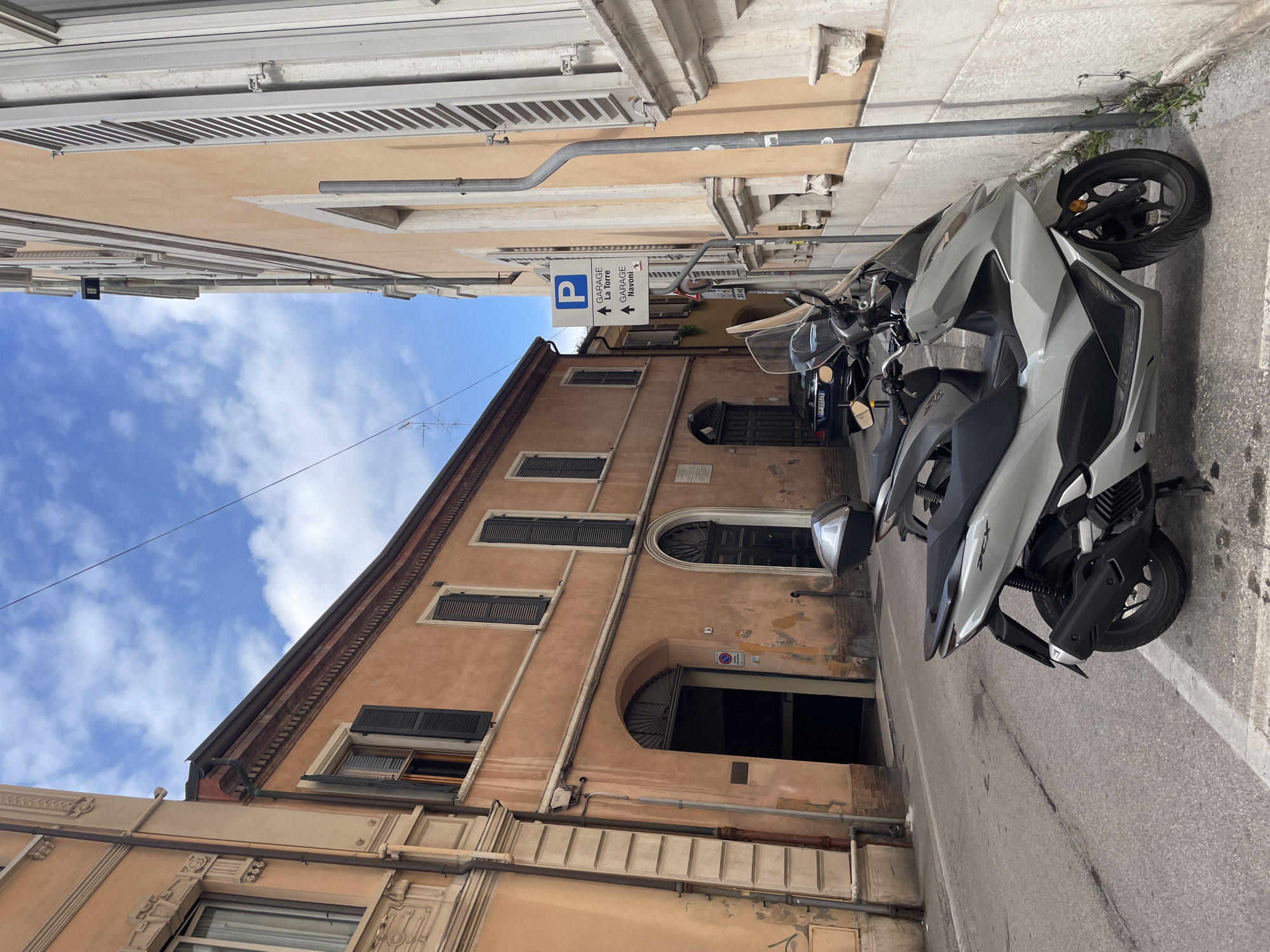 street scene in Ravenna, Italy, dominated by two parked motorcycles on the right side of the frame. The motorcycles are of different colors, with a light grey one in the foreground and a dark one behind it. A parking sign indicating directions to "Garage La Torre" and "Garage Navoni" is visible. The background features buildings with peach-colored facades, brown shutters, and arched entrances. The sky is partly cloudy, visible in the upper left corner. The street appears narrow and paved with asphalt. No people are visible in the scene.