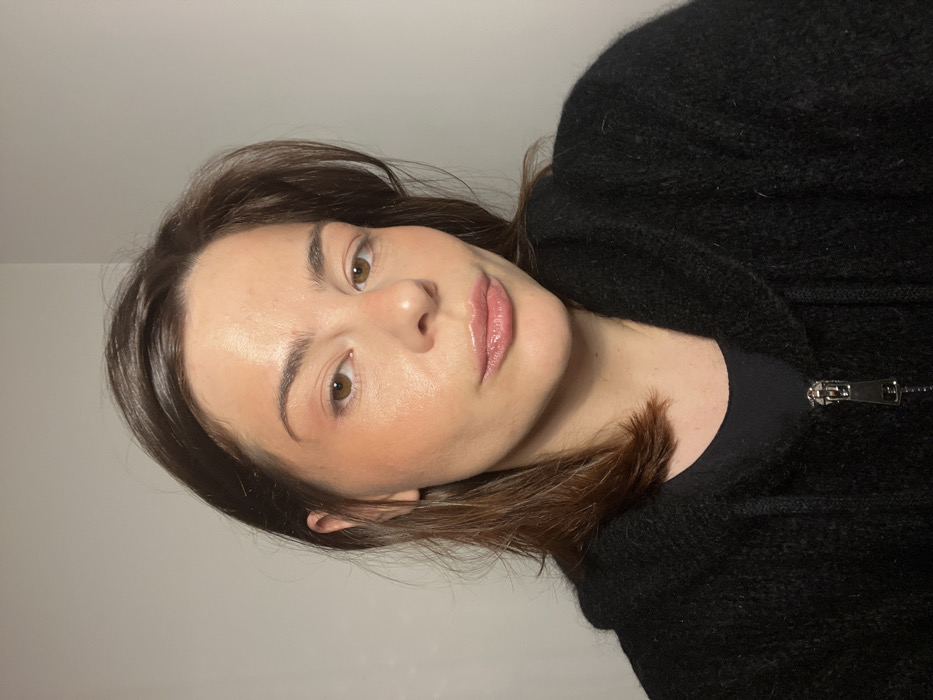 A young woman poses for a selfie. She has light skin, brown hair, and brown eyes. She is wearing a black fuzzy jacket with a zipper that is partially visible. Her lips are glossy and her cheeks have a touch of blush. The background is a plain light color. The image is rotated, causing the woman to appear at an angle.
