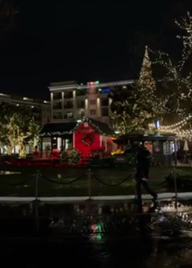 festive, dimly lit outdoor scene at night, likely during the Christmas season