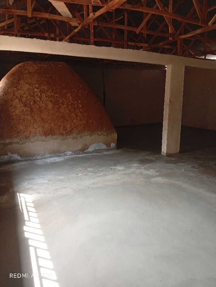 The image displays an interior scene located in Ube, Nigeria, featuring a large, dome-shaped earthen structure dominating the left-center. This structure is reddish-brown with a visibly cracked surface, suggestive of sun-baked clay or mud, and possesses a lighter, smoother base. The floor is light grey concrete, exhibiting varied textures and some darker, possibly stained, areas toward the rear. Strong rectangular patterns of natural light are cast onto the front-left portion of the floor, consistent with light entering through a barred window or vent. Above, an exposed wooden truss roof system is discernible, supported by a horizontal concrete beam spanning the upper frame. A vertical, light-colored concrete pillar supports this beam on the right side of the image. The background walls are dark and featureless. No individuals or active processes are visible in the static scene. The environment appears functional, resembling a processing facility, workshop, or storage area, with the earthen dome likely serving as an oven or kiln.