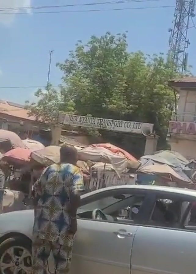 busy street scene during daylight hours. Pedestrians walk along the road, navigating around vehicles and market stalls covered by umbrellas. Buildings line the street, including a pharmacy and a bookstore. A sign indicates the presence of the "New Nyanza Transport Co. Ltd." A silver car is parked on the street, and another vehicle is visible in the left side of the frame, bearing an advertisement for "Borrowlite." A cell tower rises in the background.