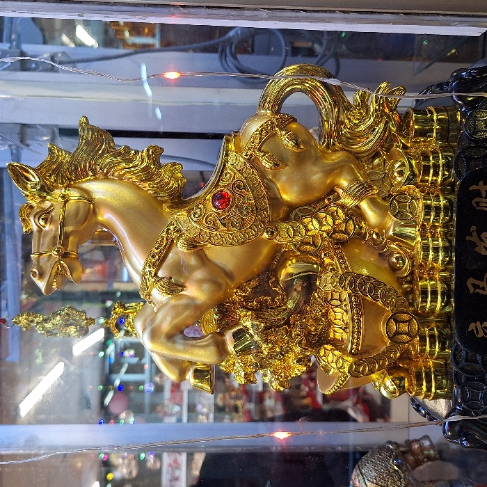 A golden horse statue, elaborately decorated with coins and ornamental details, is displayed within a glass case