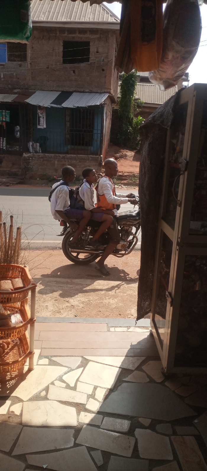 The scene depicts a street in Ogidi, Nigeria, captured from an indoor vantage point. A dark-colored "KYNSTONE" motorcycle, traveling from right to left, occupies the midground. It carries three males: an adult driver, bald and wearing a white long-sleeved shirt with an orange safety vest, and two younger male passengers in white shirts and dark shorts, appearing to be school uniforms. The rearmost passenger carries a dark backpack. They are traversing a paved road with a dirt shoulder. In the background, a two-story building constructed of unpainted concrete blocks or bricks features a dark, open window on its upper floor. The ground floor houses a small commercial establishment with a corrugated metal awning (black and white stripes) over a blue-painted facade with security bars. Further background elements include additional buildings with corrugated metal roofs and a tall, slender green plant. The foreground consists of an irregular light-colored flagstone floor, partially illuminated by strong sunlight, creating distinct shadows. To the left, a tan three-tiered plastic woven shelf contains unidentified items, with a bundle of thin sticks behind it. To the right, a portion of a dark-framed display cabinet is visible. Above, out of frame but hanging into the upper right corner, are draped items, including fabric and a plastic-wrapped object.