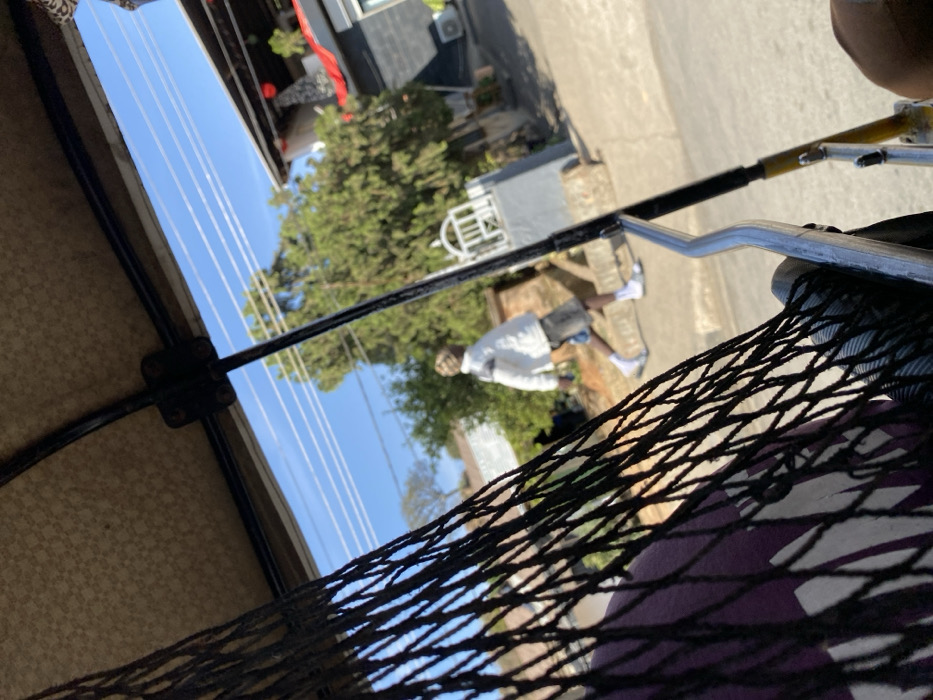 The image, captured from the interior of a motorized tricycle (Keke Napep), depicts a street scene in Jos, Nigeria, under a clear blue sky. The vehicle's beige patterned roof is visible in the upper-left, with a black mesh safety net prominently in the left foreground. A black metal support frame and a silver horizontal grab bar are also part of the vehicle's interior. Outside, a person with light-colored hair, wearing a white jacket with dark stripes on the sleeves, grey shorts, white socks, and white slides, is captured mid-stride, walking from left to right on a light-colored paved surface. Behind this individual, a low concrete structure and a white decorative arch or baluster are visible. The background features abundant green trees and bushes. To the left, a light-colored building is partially obscured. To the right, a distinct building with a dark facade, red architectural elements, and an exterior air conditioning unit is present. Multiple thin, horizontal power lines stretch across the upper sky. The scene represents a typical urban or suburban street environment within Jos.